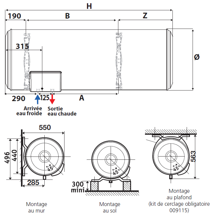 DIMENSIONS (mm) : Ø 530 - H 840 - A 250 - B 500 - Z 150