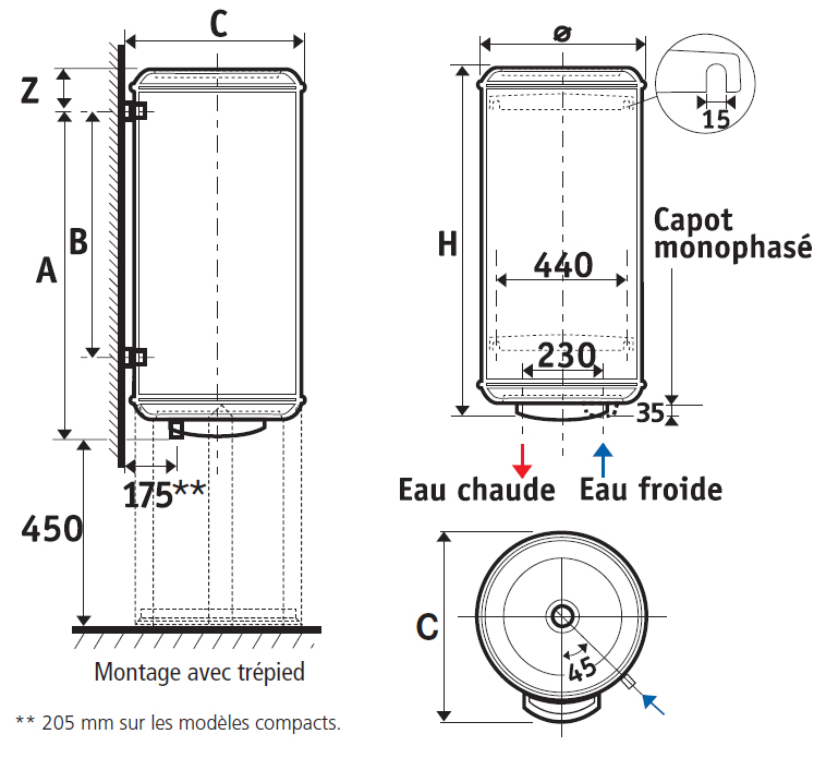 * De 15 à 65 °C. ** Pour un appareil réglé à 65 °C et une ambiance à 20 °C. *** Quantité d’eau chaude mitigée à 40 °C fournie par l’appareil réglé à 65 °C.
