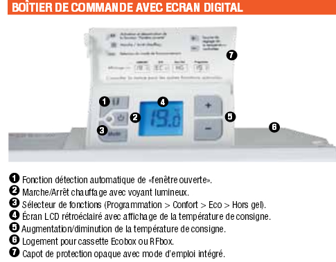 - Multi-tarif programmable par fil pilote : Confort, Confort -1°C, Confort -2°C, Eco, Hors gel, Arrêt.